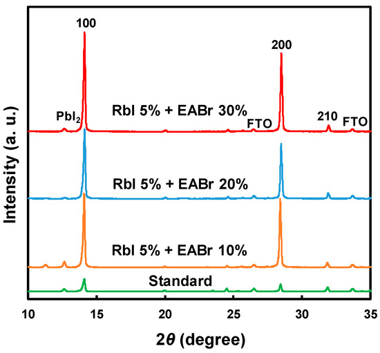 Figure 6 shows the results of the X-ray diffraction patterns, showing that the intensity of the perovskite peak is enhanced in the Rb and EA doped system. This suggests that the orientation of the perovskite crystals has been improved.