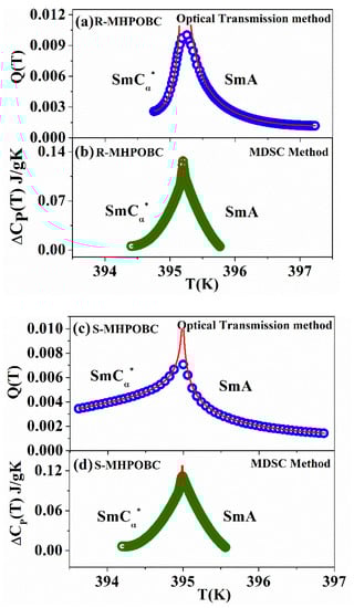SmCα* phase is the chiral ferroelectric tilted phase. The specific heat capacity anomaly also shows a small peak corresponding to this transition both for R and S-enantiomers as shown in