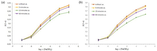 In the case of CS microspheres—Figure 2a, the results obtained for UV-Vis are similar to those for AS—Figure 1a. The use of ultrasound did not contribute to the improvement of the chemosensory properties of the system and could even cause the narrowing of the obtained linear range. However, in the case of fluorescence, opposite effect can be observed, Figure 2b, where the sensitivity of the tested system significantly improves with increasing exposure to ultrasound.