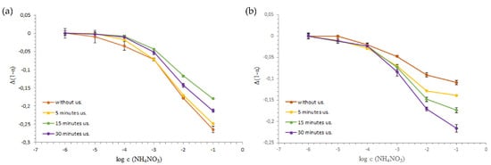 The sensory response of the four independent replicates of the AS and CS microsphere suspensions was examined by recording the spectra in the absorbance and fluorescence modes against perchlorate and ammonium ions, respectively. Test solutions were prepared in appropriate buffers, 0.01 M HEPES pH 7.4 and 0.01 M Tris-HCl pH 9, to make the obtained changes of the chromoionophore spectrum independent of pH. The buffering is necessary so that only the target ion concentration changes the spectral evolution. Four batches of each of the optodes were prepared, which differed from each other in the time of exposure to the ultrasound. The signals were determined as a change in the protonation degree of the chromoionophore (1-α), which means the normalization of the obtained absorbance or fluorescence intensity towards signals recorded for totally protonated and unprotonated chromoionophore (in the presence of 0.1 M HCl and 0.1 M NaOH, respectively). To make the obtained results easier for comparison, the calibration graphs show Δ(1-α), the difference between the values of protonation degrees obtained for respective concentration and the lowest analyte concentration. The obtained results, Figure 1a, clearly show that in the AS optical system, ultrasounds used for 5 and 30 min caused a slight loss of sensitivity towards the tested ions, while the linear range did not change and it spans a wide range from 10 µM to 0.1 M. Sonication lasting 15 min considerably worsens the sensitivity of the tested system. The spectrofluorimetric signal Figure 1b gives a similar picture to the data obtained with UV-Vis, and apart from the loss of sensitivity, the perchlorates are determined over the entire concentration range.