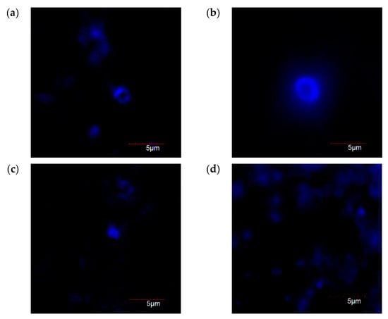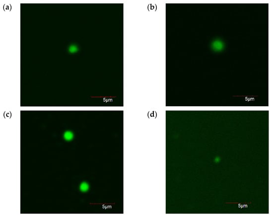 Confocal microscope images of CS microspheres: (a) fabricated without the use of ultrasound; (b) after 5 min under ultrasound treatment; (c) after 15 min under ultrasound treatment; and (d) after 30 min under ultrasound treatment.