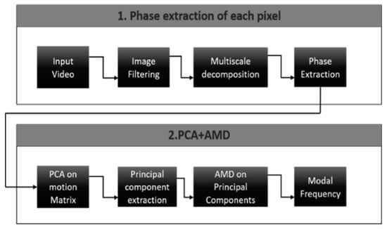 where ϕ(x) is a mode shape matrix with τi(x) as the ith mode shape and q(t) is the modal response vector with qi(t) as the ith modal coordinate. Equation (1) is overcomplete with high spatial dimension (due to large number of pixels) and low modal dimension over the complete model, thus the modal identification problem cannot be solved directly []. The dimension of the phase matrix is reduced by PCA and then AMD is used for separating the signals.