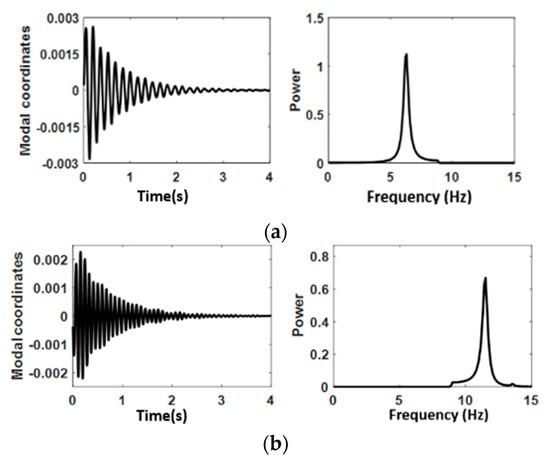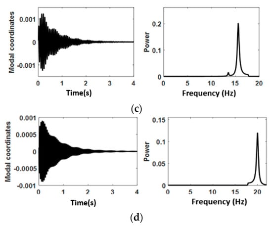 Among twelve masses, the first (m1) and last (m3) masses are 2 kg, and all other masses are 1 kg, as represented in Figure 2. The stiffness of all the springs used is 20 KN. The damping matrix is taken proportional to the mass matrix. The first four theoretical mode shapes are used to construct the new response . The new displacement response is the input for the PCA. The PCA gives the number of components through the eigenvalues of the covariance matrix of displacement data, and it identified that there are only four active components. The results are shown in Figure 3 and Table 1.