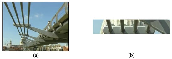 The proposed method is implemented in full-scale field measurement to obtain the vibration response of the London Millennium footbridge, also known as the wobbly bridge []. It is a steel suspension bridge, as shown in Figure 4, and it shows the cropped frame of a video [] to the region of interest used for the blind identification of modal frequency. The cropped video has a resolution of 480 p, 480 pixels in width, and 60 pixels in height. The number of frames used is 600, with a frame rate of 30 FPS. The bridge swaying occurs as the pedestrians’ walking frequencies and the bridge’s natural frequency range matches well. Only three frequencies are detected as the pedestrians walking patterns might have only three dominant frequencies. The three modes are identified from the EVD plot from the implementation of the PCA-AMD algorithm. The modal coordinates and their frequency values are presented in Figure 5. The modal coordinates are not accurate and are non-decaying due to the pedestrian’s movement. Table 2 shows the comparison between the estimated results with the sensor data, and they are in good agreement with higher than 99% accuracy. The results have revealed that the proposed method can be extended to other spontaneous robust non-contact OMA structures.