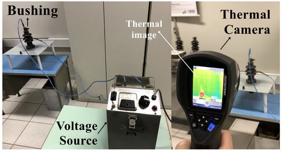 In real-life scenarios, insulation systems are constantly contaminated with dust, which can promote PD activity. Therefore, a transformer’s bushing was contaminated with powdered graphite to emulate this condition. Additionally, a high voltage AC source (0–40 kV) was connected to the extremities of the component to induce partial discharges. One of the most relevant steps for the improvement of maintenance planning is the PD evolution assessment. Due to material deterioration, the electrical charges produced by the failure increase. Based on this behavior, the PD evolution was carried out by increasing the voltage level for the same contamination pattern. The PD started at 13 kV, and, after that, the voltage was increased by a step of 2 kV up to 23 kV, totaling six different flaw levels. For each level, 20 images were taken using a thermal camera (FLIR, −20 °C to +400 °C, 19.200 (120 × 160) pixels). Additionally, 20 more images were taken when the insulator was without PD activity (0 kV) to assess the effectiveness of thermal analysis for PD evolution. Figure 1 shows the experimental setup.