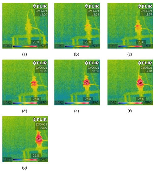 Thermal imaging of bushings subjected to (a) no discharge; and discharge levels generated by: (b) 13 kV; (c) 15 kV; (d) 17 kV; (e) 19 kV; (f) 21 kV; (g) 23 kV.