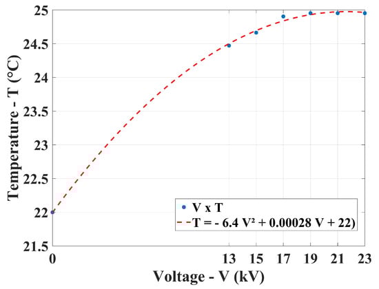 Figure 2 presents the thermal images taken for all PD levels. It can be noted that the thermal analysis is suitable to perform PD evolution detection since the temperature increases with the PD activity. By Figure 2a, when the failure is not present at the component, the average temperature was 22 °C. After the PDs started, it can be observed hot spots promoted by failure heat emission. However, the visual analysis was not enough to perform a quantitative estimation of PD evolution. Furthermore, in some figures, the effects of the faults in the thermography are too subtle (e.g., Figure 2b) and may not be detected without the development of a specific index. On the other hand, in Figure 2e–g, it is hard to define which one represents the highest PD level, reiterating the creation of new imaging processing approaches. A basic analysis of the maximum temperature value is not sufficient to assess the PD evolution since the maximum temperature spot of the image remains at 25 °C for PDs higher than 17 kV, as shown in Figure 3.