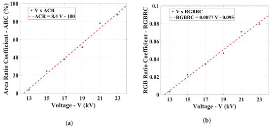 Therefore, based on these issues, the feature extraction of PD evolution was achieved by the novel indexes ARC and RGBRC, according to Figure 4. By analyzing the results, it can be noted that ARC and RGBRC indexes increase with the PD evolution. The strong correlation between the voltage levels and the indexes allows a linear regression. Then, the regression equations presented in Figure 4a,b can be applied to estimate the PD level based on the thermal images.