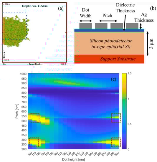 (a) Collision cascade from Montecarlo simulations inside silver layer; (b) schematic cross section of the proposed device, from top: silver nanograting, silicon nitride dielectric and silicon photodetector; (c) finite-difference time-domain [] of simulated absorption at a wavelength of 950 nm normalized to the absorption of silicon covered with perfect anti-reflective coating (PARC).