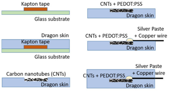 - Finally, copper (Cu) wires were attached using silver epoxy paste. A sandwich-type structure was realized by pouring another layer of DS, which flows into the CNT network and cross-linked with the bottom layer of DS. The top Dragon Skin layer encapsulated fully and firmly the CNT sensing material, thus improving the robustness of the device.
