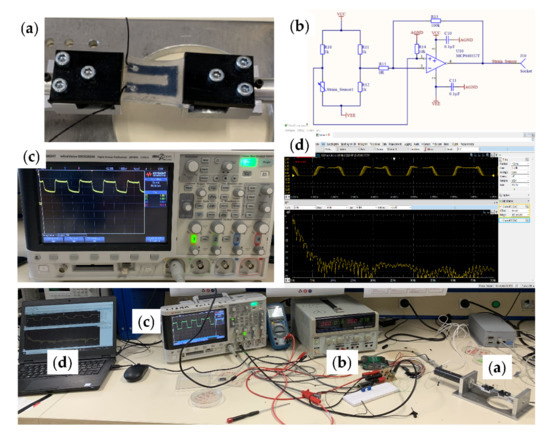 Experimental platform: (a) Strain sensor test by E-861 PiezoWalk® NEXACT® Controller; (b) Wheatstone bridge structure for the rat respiration monitoring; (c) output DC voltage signal verified by oscilloscope; (d) output DC voltage signal shown by the multifunction portable device (Analog Discovery) and its fast Fourier transform.