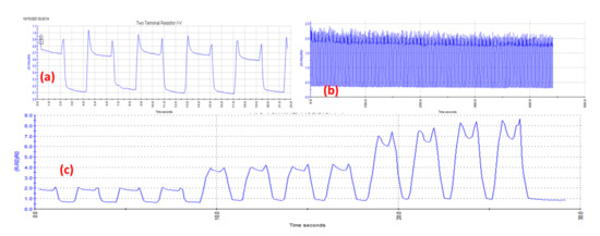The relative resistance variation of the strain sensor ΔR/R0 was measured under repeated stretches by applying different stretch values (Figure 3b,c). When the stretch length of the strain sensor was equal to 0.36 mm, the ratio ΔR/R0 changed from 0.1 to 0.7 (Figure 3a). As the applied stretch force was cyclical, the signal curve was also repetitive. There are some peaks, which were observed at the beginning and the end of the square signal. Such “instantaneous stretch-relax” phenomenon might be related to the elasticity of the strain sensor. These measurements showed that the sensor resistance is stable and that the electrical characteristics of the sensor are maintained.