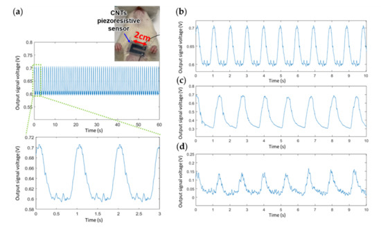 After the validation, such CNTs/PEDOT:PSS-based strain sensor was reversibly attached above the rat chest for its respiration monitoring during anesthesia. Isoflurane (2.5%) was used to make the rat sleep during the experiment [8]. The regular respiration curve for 60 s is shown in Figure 4a. The output voltage evolution is between 0.6 and 0.7 V. For 1 min, the rat respiration rate during the rest equals 62 times/min, which corresponds with the theory value [9]. The electrical monitoring result is very reliable and repetitive. The experiments were carried out by using three different rats, and stable electrical sensing curves were obtained (Figure 4b–d). The rat’s state was also monitored by the cardiogram, which detected the cardiac frequency during the rat anesthesia (See Figure 5). The actual measurement was obtained from conventional electrocardiogram (ECG) recording obtained by surface-needles two-lead electrodes, using Powerlab and Chart system (ADinstrument).