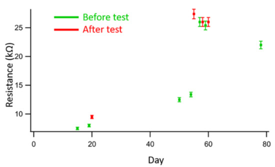 One major drawback we found with this type of sensor is the drifting of the nominal resistance that occurs after intensive stretching of the sensor. We experimented with the aging of the sensor by measuring its nominal resistance over several weeks and by stretching at different times. We found that the nominal resistance increases slightly with time but mainly after testing experiences, as shown in Figure 6. The mechanism behind this shift in resistance is not well known and we think that permanent changes in the CNTs network can occur with time but also when the sensor is used for large (>10%) elongations. Carbon nanotubes may move within the polymer composite and contacts between CNTs may break during large elongations.