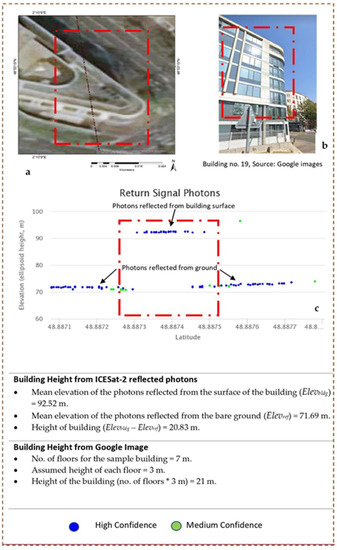 | Building. No. | Mean Elevation of the Building (Elevbldg) m | Mean Elevation of the Adjacent Bare Earth (Elevref) m | Heights of the Building Computed from ICESat-2 Profile | Heights of the Building Computed Using Google Photos | Height Difference | % Error |
