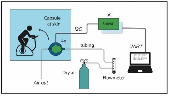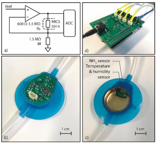 It is estimated that a sensor with a detection range between 0 and 100 ppm is required, by using data about NH4+ in sweat found in the literature [7], sweat rate and volumetric flow rate of air through the capsule. Based on measurement range, price, and ability to integrate this sensor in a wearable, the MICS-5914 semiconductor metal oxide gas sensor (SGX Sensortech, Neuchâtel, Switzerland) was selected. This sensor consists of an Si/SiO2 substrate with 4 gold–platinum electrodes. Two electrodes are used for heating the sensor and two are for performing the measurement. The metal oxide sensing layer including tungsten nano-plates is placed on top [13]. When the sensor is exposed to NH3, the resistance across the sensing electrodes will drop. Next to NH3, the sensor is sensitive to ethanol, hydrogen, propane and butane. These gases will not be formed during sweating in general conditions. Figure 1 shows a schematic overview of the entire measurement system. We use a series–series feedback circuit to read out the sensors (Figure 2a). This circuit has a linear response, which facilitates calibration. It also reduces noise, distortion, and variations due to temperature influences. The circuit includes the precision operational amplifier LTC2057 (Analog Devices, Norwood, MA, USA) and the MCP3421 (Microchip, Chandler, AZ, USA) analog to digital converter with differential input is used. These electronics with a single NH3 sensor and a humidity and temperature sensor (HDC1080, Dallas, Texas Instruments) are placed at a small PCB (34 mm × 28 mm), that is designed to fit in a capsule (Figure 2b,c). The capsule can be taped to the skin of the athlete. The sensors are placed inside the capsule and the other supporting electronics of the readout circuit are placed at the other side of the PCB, outside the capsule. The capsule PCB is connected to a shield that contains the current source for the heater circuit, the connection to a power supply and a multiplexer to switch between different capsules. Data of four sensor capsules can be read out with an STM32F411RE microcontroller board (STMicroelectronics, Geneve, Switzerland) (Figure 2d). It was chosen to place the sensors as close as possible to the collection surface, to prevent that NH3 is absorbed by the materials of the capsule and the tubing before the NH3 molecules are detected. A thin gold layer was sputtered on the inside of the capsule to prevent absorption in this area. The capsule itself is made of a 3D printed flexible photopolymer (Connex 3, Objet 350, Stratasys, Rehovot, Israel) and has a collection surface diameter of 26 mm. The airtight capsule will be placed at the skin with a double-sided acrylate adhesive (3M 1522, [14]) During the in situ experiments, the capsule can be ventilated with dry air at a flow rate between 0.2 and 1.2 L/min, depending on the type of exercise test that will be performed.
