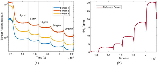 (a) Sensor resistance plotted over time during the calibration experiment. The sensors are exposed to an environment with different concentrations of NH3. (b) The reference measurements during the calibration experiment with the calibrated S900 sensor (Aeroqual, New Zealand).