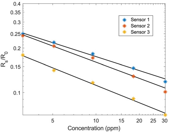 Sensor resistance (Rs) divided by baseline resistance (R0) plotted against [NH3] in ppm measured by the reference sensor. Data were fitted using a power function: y = a·xb.