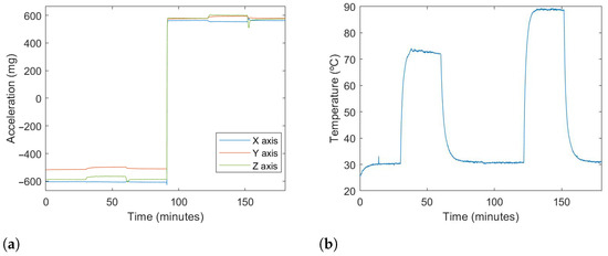 The accelerations and temperature during the tests are shown in Figure 4. In Figure 4a, the three axes’ accelerations are shown, where both positions can be clearly distinguished. The temperature record is shown in Figure 4b. A correlation between the thermal variations and the acceleration value can be perceived between both images.