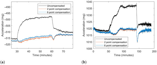 The difference between both techniques is in most cases lower than the sensor’s noise. With the obtained data, the differences with a 1G acceleration are smaller than 0.06 mg/°C in all cases, with the average being 0.32 mg/°C. Some examples of the thermal compensation with both techniques can be seen in Figure 5.