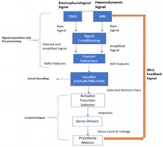 A host of other sensing modalities have been investigated for the use of prosthesis, such as electroencephalography (EEG), near-infrared (NIR), as shown in Figure 1, and mechanomyography, to name a few. EMG continues to be the most widely used sensing modality for prosthesis control, where studies discussed as part of Section 2.2 involve cases where EMG has been used independently or in combination with an auxiliary sensing modality [3,13,14].
