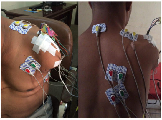 The literature is sparse in the area of prosthesis control interface for shoulder disarticulate amputees. Key work, which included the simultaneous acquisition of EMG and vibration signals from amputees (as shown in in Figure 4), also involved the application of an extended set of features to accurately recognise different variants of shoulder girdle motions across a number of amputees [5,19]. Due to the unnatural association between shoulder girdles and potential hand gestures in a prosthesis limb, cognitive loading is likely to be an issue for the prosthesis users and threatens a potential abandonment of the prosthesis limb, as has been noted previously. Thus, neuromuscular reprogramming therapy, as proposed by Nsugbe and Al-Timemy [5], can be included as part of the process of familiarising the amputee with the use of the technology in order to boost intuitiveness and control of the prosthesis limb, and ultimately minimise cognitive loading [20]. In terms of the ergonomics of sensor placements and the associated electrodes, electrode selection exercises can be conducted via a forward selection algorithm which can help boost parsimony and trim down the number of electrode sites, while increasing classification accuracy. Furthermore, in order to boost sensor robustness, wearable embroidery electrodes can be considered for use as part of the prosthesis control system, which would also contribute towards further affordability of the prosthesis limb [21].