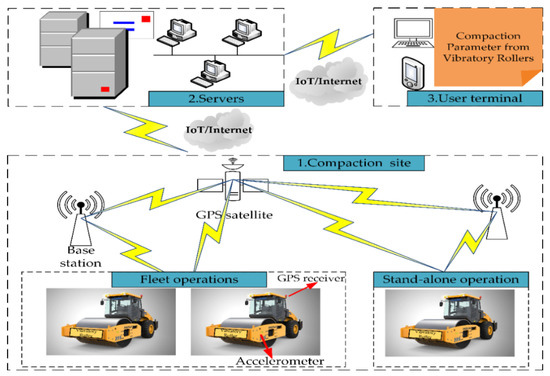 The application of the Internet of Things (IoT) in vibratory rollers is mainly reflected in operation monitoring, real-time positioning, and intelligent control. Instrumented with GPS, various sensors, a computer system and IoT, the intelligent vibratory roller can measure the compacted material’s stiffness and the equipment’s running state in order to achieve the best compaction effects [3,4]. Therefore, this paper proposes a compaction operation monitoring system for an intelligent vibratory roller based on IoT, as shown in Figure 1.