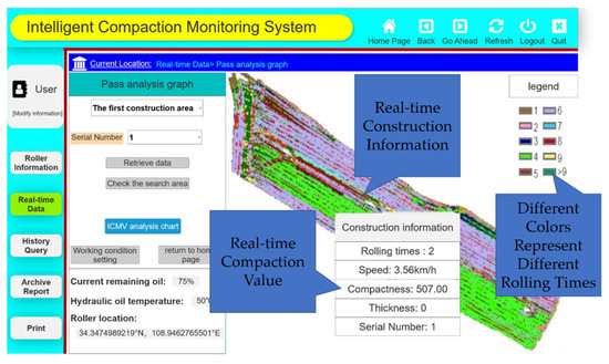 Through the software, we can see the various parameters of the roller that is undertaking the compaction operations. One of the most important functions of the monitoring software is real-time data viewing. The real-time data includes the current number of rolling times and real-time compaction values, as shown in Figure 5.