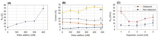 The above-listed salts are quite hygroscopic, which we found to be problematic, since even minor amounts of water in the working solution negatively affect the electropolymerization of thiophene. We investigated thiophene polymerization in acetonitrile with KPF6 as a supporting electrolyte and found that films decreased in thickness and conductivity when water was added to the dried working solution. The charge transfer resistance of the films increased with increasing water content to values >1000 Ω for the addition of 500 mM water, as can be seen in Figure 1A. Furthermore, as the EDX of the obtained films showed, they not only decreased in thickness—demonstrated by the decreasing amounts of carbon and sulfur and the increasing amount of gold—but also showed an increasing oxygen content (see Figure 1B). This points at the incorporation of carbonyl groups [10], which would interrupt the movement of charge carriers, which accounts for the polymers’ conductivity. We found that drying the solution of the counter ion/solvent over a molecular sieve for at least a week constitutes a simple yet effective method to remove water and allow for successful electropolymerization.