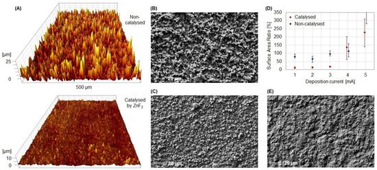 In addition to enhanced electron transfer, a smooth surface is advantageous for the construction of electrochemical biosensors. We observed that this could be achieved by the utilization of ZnF2. The calculated surface area ratio from white light interferometry is pictured in Figure 2D. With the help of the catalyst, films resulting from synthesis at 1–3 mA were only marginally rougher (11.6–18.9%) than the uncoated electrode (5.2%), while films from non-catalyzed synthesis were significantly rougher (65.0–96.7%). A visualization of the surface topography of films deposited with 3 mA is presented in Figure 2A. The 3D white light images are accompanied by corresponding SEM images (see Figure 2B,C). Without the use of the catalyst, films were produced whose surface was of hyphae or root-like structure, while films from catalyzed polymerization showed a globular surface structure. Such smooth film surfaces minimize the steric hindrance of subsequently immobilized bioreceptors and therefore should grant improved target binding.