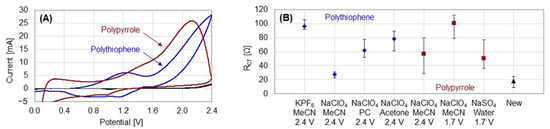 (A) Oxidation of polythiophene and polypyrrole during cyclic voltammetry in 2 M NaClO4 in acetonitrile with a scan rate of 500 mV/s. In black, CV of cleaning solution. (B) Removal of polymer films with different counter ions (500 mM) and solvents (MeCN: acetonitrile, PC: propylene carbonate). Three films were removed with each cleaning solution for 1 min. The distribution of RCT of five new electrodes is included. Reprinted from [6], Copyright (2021), with permission from Elsevier.