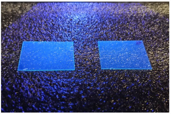 Two 30 × 40 mm2 tiles of a PEN thin-film scintillator illuminated with UV light.
