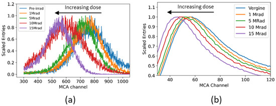 Light yield spectra of proton irradiated thin-film PEN scintillators excited by (a) alpha particles from a 241Am source and (b) electrons from a 137Cs source.
