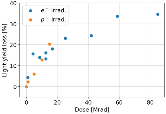 The percentage light loss after irradiation was then computed as a function of the delivered dose. Similar trends were observed in measurements with Am and Cs. In Figure 4, we report the percentage light yield loss measured with the Cs source in samples irradiated with protons and electrons.