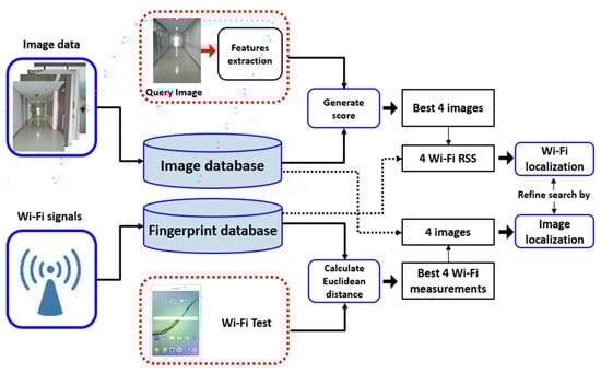 Although each method (image or Wi-Fi-based) can be used individually for indoor positioning, both methods have advantages and disadvantages. Wi-Fi localization has relatively high accuracy but requires high infrastructure costs. Sometimes, Wi-Fi access points (APs) do not work temporarily or change, requiring re-calibration of the whole system. The most challenging problems in image-based approaches are an intensive computational cost for extraction of features from the images and image recognition in a large building due to locations with similar appearances. Thus, various methods have been developed to decrease the limitations related to indoor localization using smartphones with built-in Wi-Fi and a camera, since the development of phones has advanced spectacularly in recent years. Several studies have proposed a hybrid indoor location method using Wi-Fi signals and camera images [,,]. Hattori et al. [] demonstrated the high accuracy of a hybrid indoor localization system using image processing and Wi-Fi signals. Ching et al. [] proposed a two-phase framework that uses both Wi-Fi signals and taken images for indoor localization, where the Wi-Fi-based localization method calculates a rough location of the device, then refine the search using the images taken by the user. Niu et al. [] developed a system that combined data of Wi-Fi signals and the images of the surrounding area. In this study, we propose a hybrid indoor localization system using either a combination of images and Wi-Fi signals or Wi-Fi signals and images to estimate the location of users more accurately.