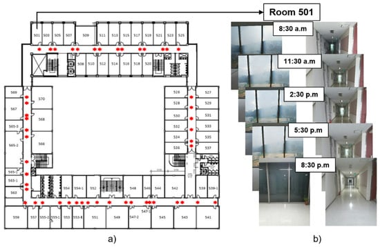 (a) Map of the floor where the red dots representing the locations for collecting image and Wi-Fi signals and (b) examples of taken database images at different times.