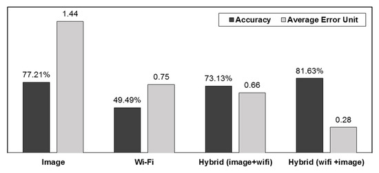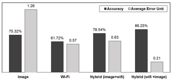 The results showed an accuracy of 73.13%. The error ranged from 0 to 19 and the average error was 0.66 (Figure 3). Although the overall results were improved relative to the Wi-Fi-based method, the accuracy was 4% lower than that of the image-based localization method. When we chose the image-based method as a base method, there was a possibility of mismatched user location due to feature similarities between query and database images. If the best four images were incorrectly matched, the Wi-Fi method could not detect the true position of the user.