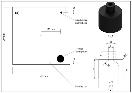 Two 3 mm diameter electret microphones were used in this study. One of the microphones were attached to the printing bed through various layers of a silicon-based adhesive, in the upper right part of the heated printed bed as seen in Figure 1a. The second microphone were housed in an ABS 3D-printed housing. The housing was fabricated with the geometry seen in Figure 1c, which was designed with the purpose of separating the sensor from the heated bed and creating an acoustic shell. The housed microphone, as seen in Figure 1b, was then attached to the printing bed through various layers of a silicon-based adhesive, in the lower right part of the heated printed bed as seen in Figure 1a.