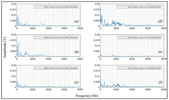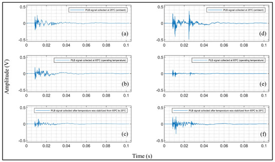 Raw PLB signal. (a) Non-housed microphone at 25 °C, (b) Non-housed microphone at 65 °C, (c) Non-housed microphone at 25 °C after process, (d) Housed microphone at 25 °C, (e) Housed microphone at 65 °C, (f) Housed microphone at 25 °C after process.