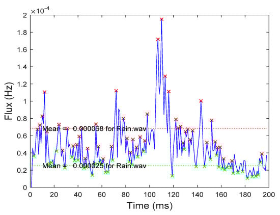 Figure 1 shows an example of post-processing frequency domain parameters. The flux values of a rain sound signal were plotted, the positive and negative peak values were automatically marked, and their average was calculated.