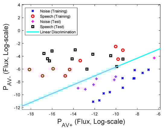 The noise studio and voice samples groups were used for training. The Pav+ and Pav− values for each training sound sample were marked in the related graphs. A separation line between voice and noise samples was defined based on linear discriminant analysis classification for each graph [13].