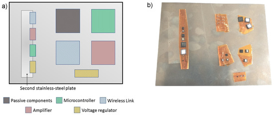 Components fixed on a stainless-steel plate two of each specimen fixed on the edge of another 120 thick plate. (a) Schematic placement. (b) Placement on the plate.