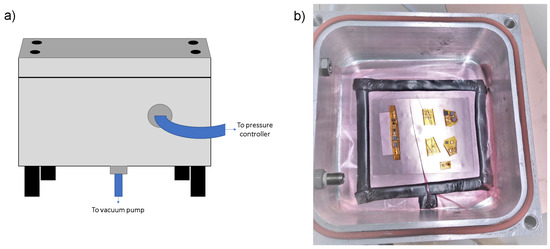 Steel box with gasket, inserted component test-plate and applied vacuum bagging film before insertion into the oven. (a) Schematic view of the pressure chamber. (b) Photography of the prepared chamber.
