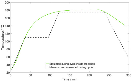 Since the experiment is carried out without the use of an autoclave, dedicated heat-up and cool-down rates could not be controlled directly. The time it took to heat up and cool down again is measured instead. The measurement point is chosen to be inside the steel-box, next to the components, inside the vacuum bagging to record the actual temperature affecting the items under test. The temperature cycle used in this work is depicted in Figure 4 as the solid green line, as well as the minimum curing cycle recommended for HexPly® 8552, represented by the dashed black line. The components themselves are held within a medium vacuum around 0.15 bar under the vacuum bagging, and a pressure of 7 bar is applied inside the pressure chamber during the whole process.