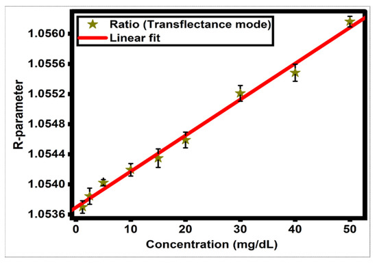 To investigate BR’s sensitivity in blood, R-parameters were deduced by collecting the MAX86916 ADC counts data and calculated using Equation (2). Figure 1 shows the SoC platform used to measure the ADC data used to compute R-parameters (). The plot of R-parameters as a function of BR concentrations is shown in Figure 2, and results showed a strong linear relationship with the coefficient of determination greater than 0.991.