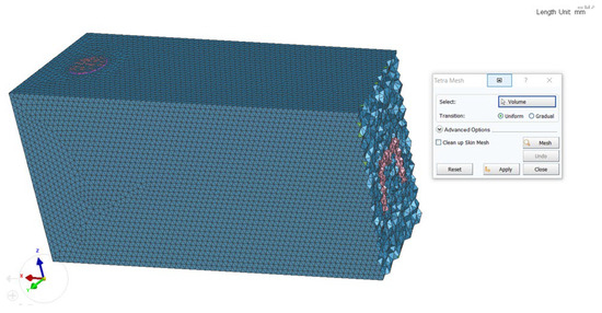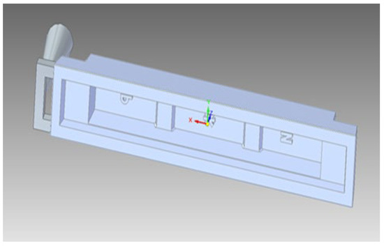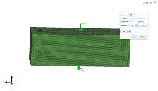 The 3D model of the “Body” part created in the Solid Works environment (Figure 1) must first be saved in a suitable format for work in the ProCAST environment (IGS). This is carried out so that the Mesh auxiliary software (mesh opening, hole, cell, closed loop) can read the surface of the object. After opening the file, if necessary, a “correction” of the geometry of the object is made. The CHECK GEOMETRY button checks the quality of the file geometry and identifies gaps in the model that can be eliminated. After fixing the geometry errors, the model is meshed (Figure 2). To reduce the calculation time, we have set the mesh size to 5 mm for the casting and 10 mm for the sand mold. After the meshing, the mesh is checked and calculated. In this case, two components are clearly distinguished—the mold and casting, which allows us to define different boundary conditions and assign different materials.