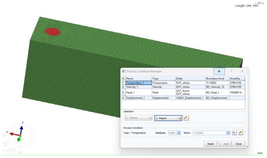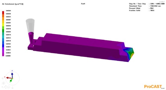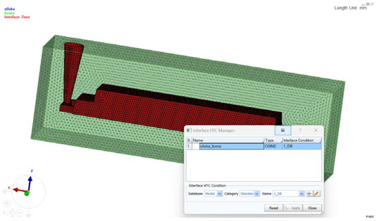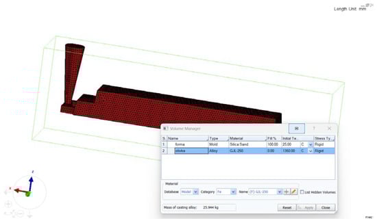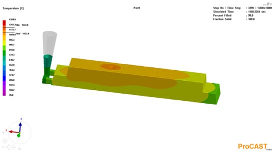After that, the pouring temperature, the gating area through which the metal enters the mold, the pouring rate, and the type of cooling were set (Figure 6).