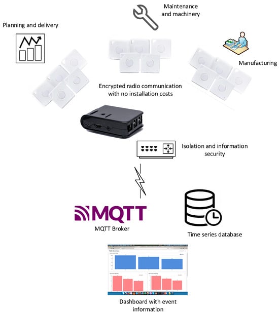 The idea is to achieve the real-time monitoring and identification of problems in manufacturing. As discussed in this paper, it is based on existing common radio protocols used for automation. We decided to experiment with Bluetooth v4.1 and v5.2 because of their wide acceptance and the myriad of devices supporting them—since this is a cost-lowering factor, it is essential to ease application in real-world scenarios. Due to the specific nature and functionality of the beacons, Bluetooth Low Energy (BLE) communication has been used to broadcast data to reception units. Positioning algorithms using individual tokens are well studied and discussed in detail in [4,5], and offer solutions for both ad hoc [6,7] and layout-/map-based identification [8]. While precise location is very important, for this particular study it is merely a prerequisite to achieve higher efficiency in production. In [9], it is described how beacons can be positioned in a way to minimize the number of needed devices and solve line-of-sight (LOS) issues in complex manufacturing environments, though this approach focuses on technological feasibility. In this study, we place the emphasis on the fact that individual beacons, data collection points and re-transmitters should be positioned in such a way that supports the optimization of the existing manufacturing and organizational processes, with the optimization of the number of devices and their maximum accuracy in terms of positioning still being very important, but ruled by the economic/production efficiency needs.