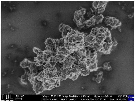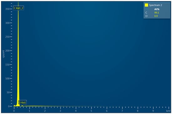 To obtain the composites, multi-walled carbon nanotubes (CNTs) and waste carbon from the production of green hydrogen by plasma decomposition of methane in an amount of 1 wt% and 2 wt% of the polymer mass were used. The multi-walled carbon nanotubes have a length of ≥2 µm, a diameter of 10–40 nm, a number of walls of 10–20 and a specific surface area of 55 m2/g. In the conducted studies of the waste carbon, it was found that the carbon (C) content was 99.1 at% and the oxygen (O) content was 0.9 at% in it (Figure 1), and its structure is shown in Figure 2.