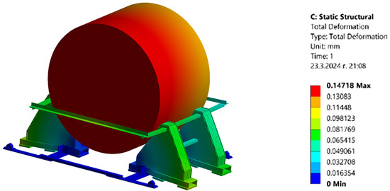 The third stage of the methodology involves the verification of the conceptual design based on the resulting loads through computer modeling in the Ansys Workbench engineering product environment. A 3D finite element model using solid elements was constructed for the strength analysis. The finite element size was varied, with a maximum size of 60 mm for the general areas of the structure and a minimum size of 5 mm in the areas of contact between the structure and the coils. Standard finite element quality requirements have been met, and solution convergence has been verified. Appropriate boundary conditions have been applied to ensure adequate performance in the service of the structure. Fixed supports were defined in the connection areas with the main bearing system, limiting the displacements in all directions. The loads to which the structure is subjected are presented in Table 1. The following three verification scenarios have been developed (Table 2):